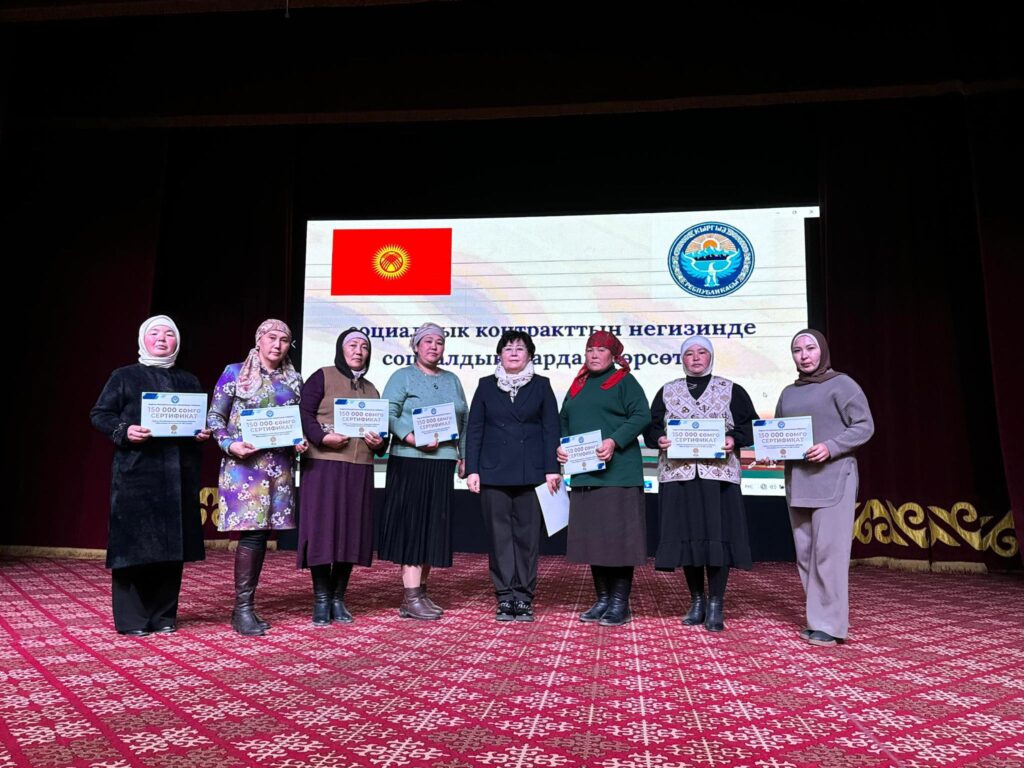 Социалдык контрактын негизинде аз камсыз болгон үй-бүлөлөргө 150 миң сомдон сертификаттар тапшырылды.